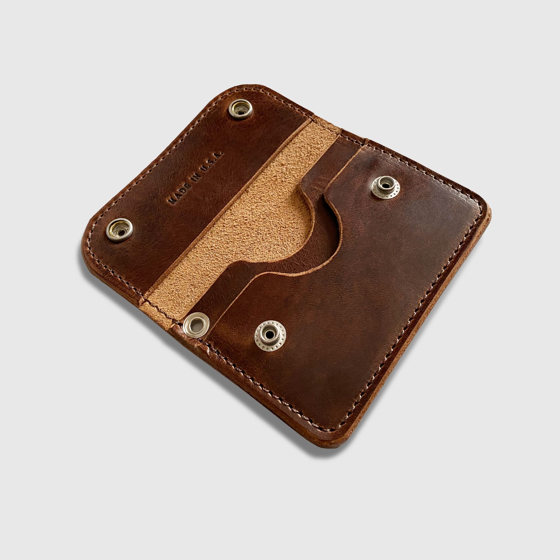 The 50cc packs all the biker wallet aesthetic but in a pit-bike sized package, making it comfortable to carry in your front or back pocket and keeps your currency safely locked inside. Each slot comfortably carries 2-4 cards or a half fold of cash, and features thumb cut-outs for easy access and a rivet to connect a lanyard or chain.