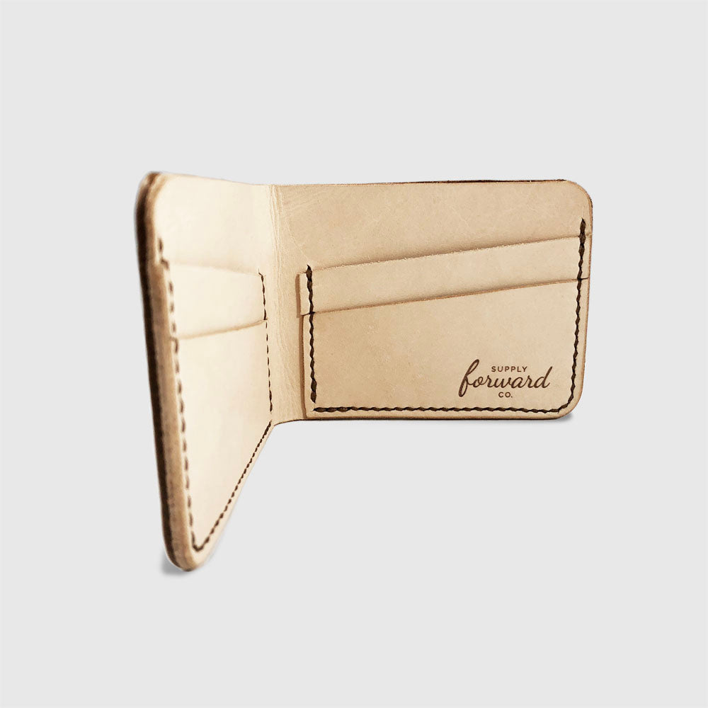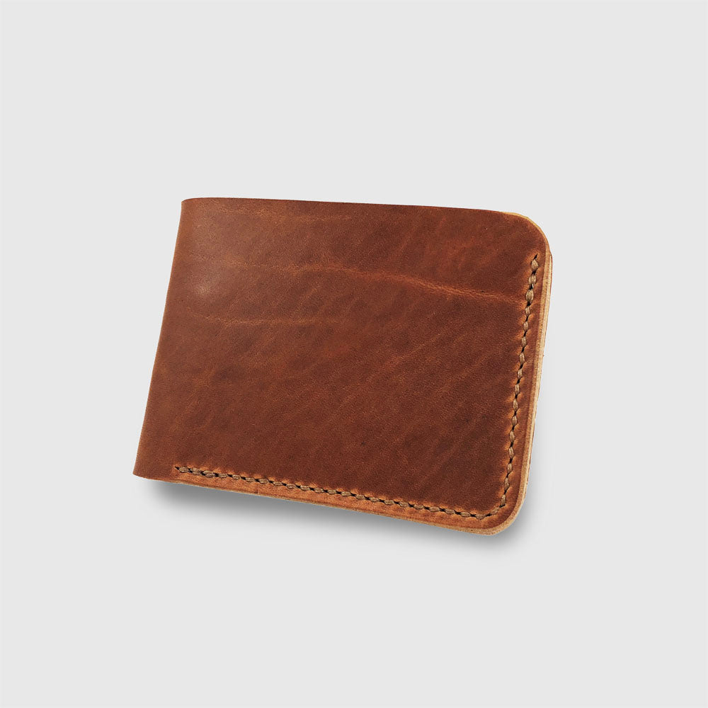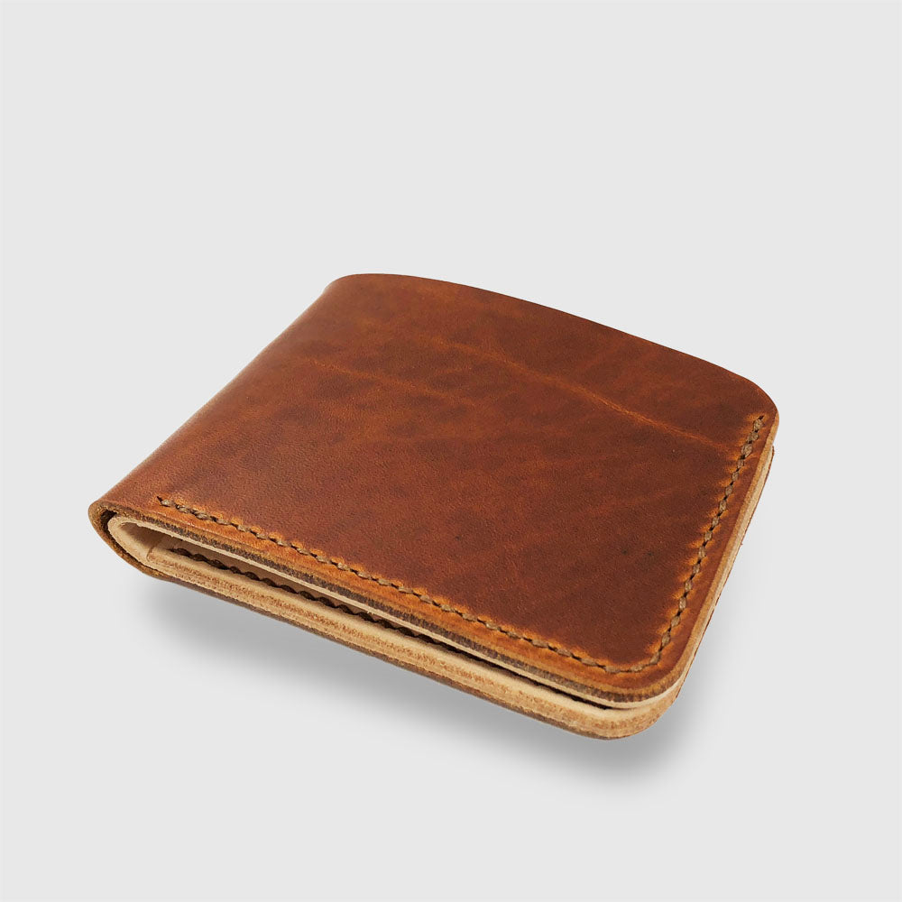 A refined, minimal take on a staple piece; the bifold wallet. Features 4 angle-cut card slots, one cash pocket, and constructed with contrasting natural vegetable tanned interior.
