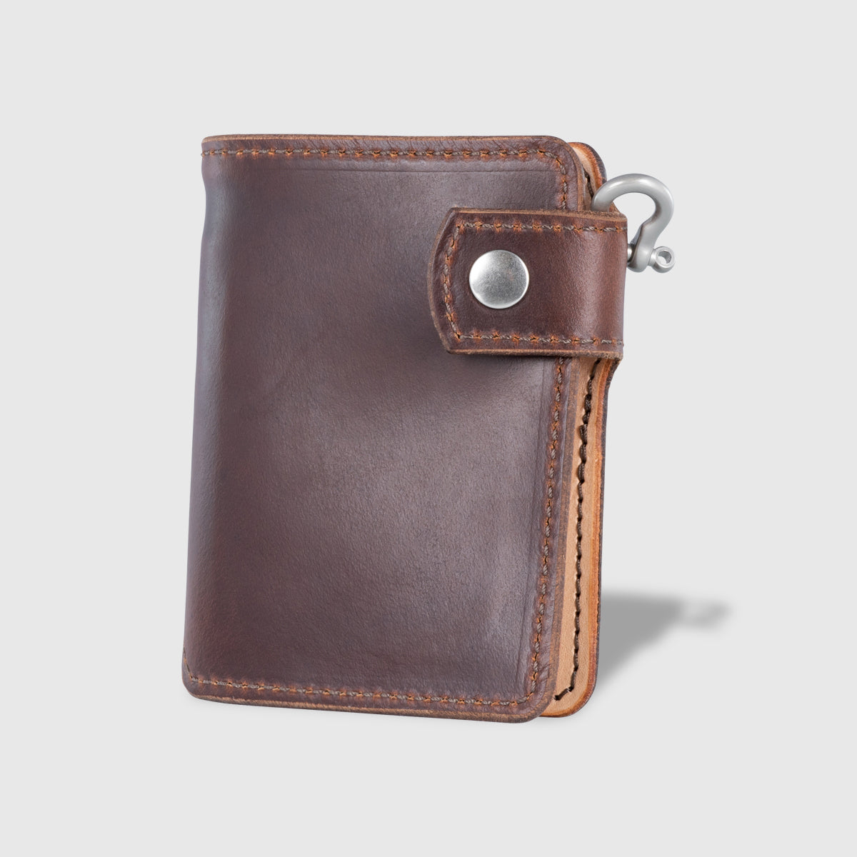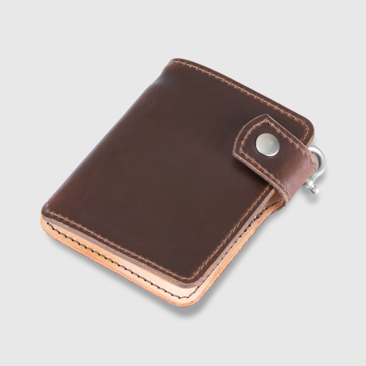 All the features of a biker wallet in a slimmed down minimal package. Features 2 angle-cut card slots, a spacious cash pocket, snap closure, and includes a shackle for connecting a lanyard or chain.