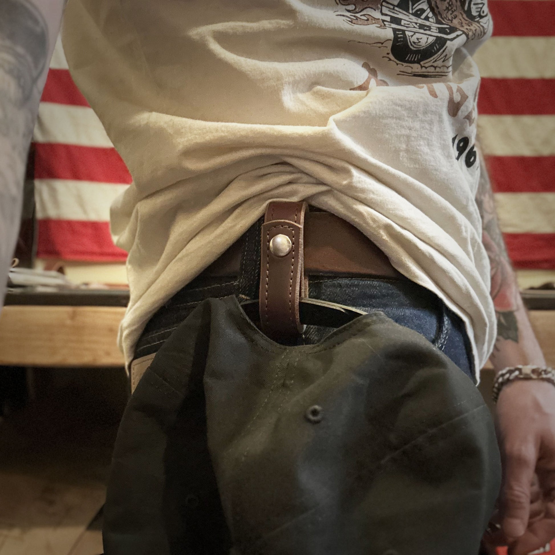 Simply undo both snaps, slide The Hat Honcho under and over your belt, snap the first snap to secure to your belt, then loop in your hat and snap the second snap. Wham bam.
