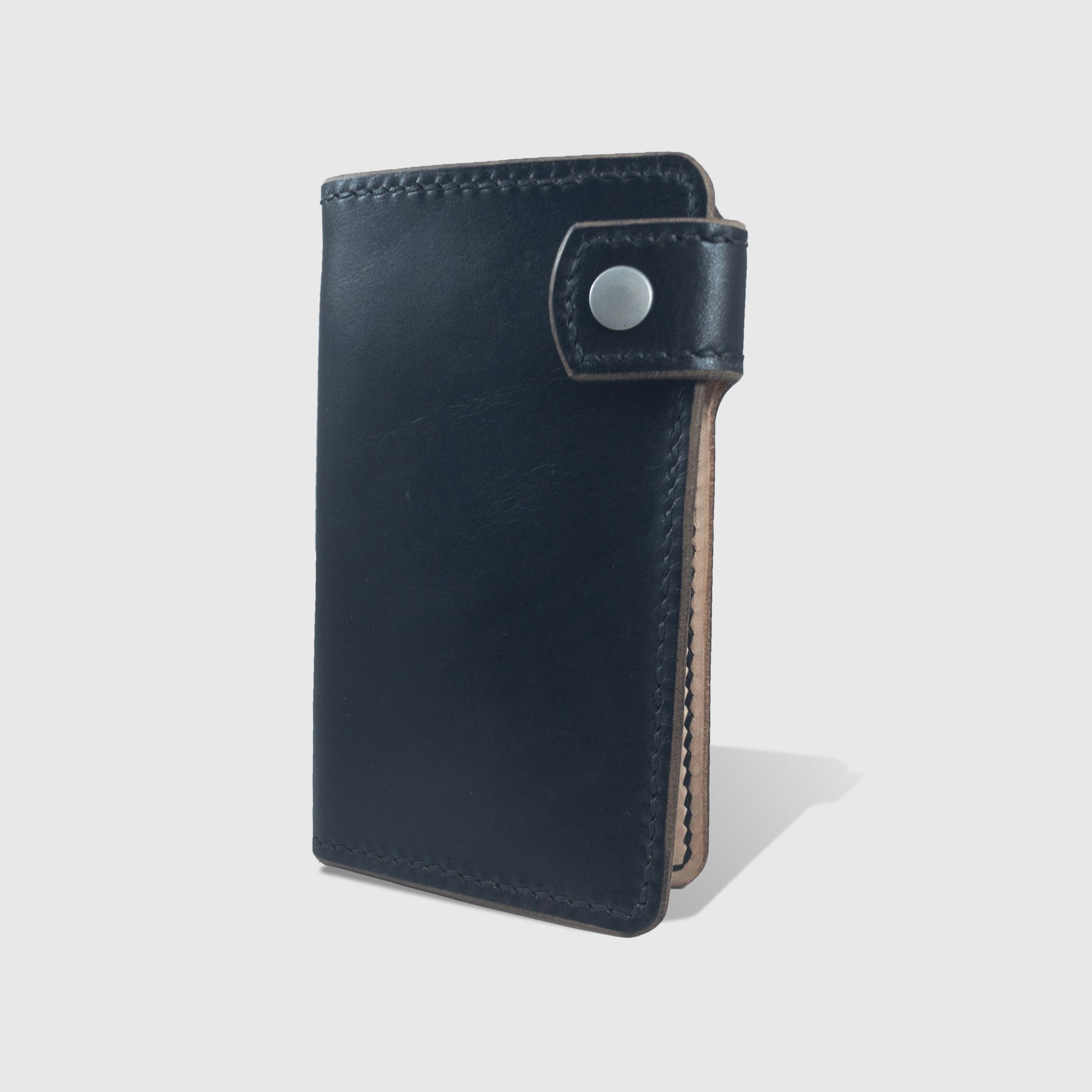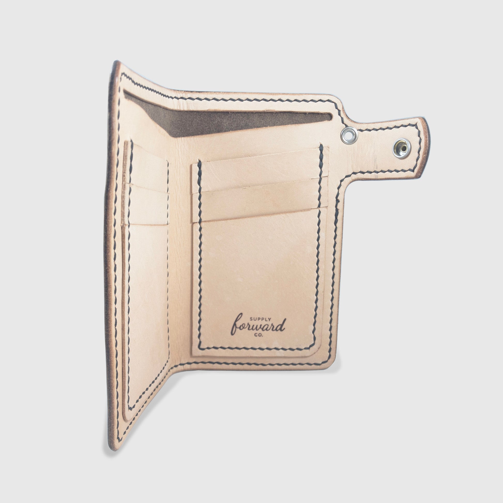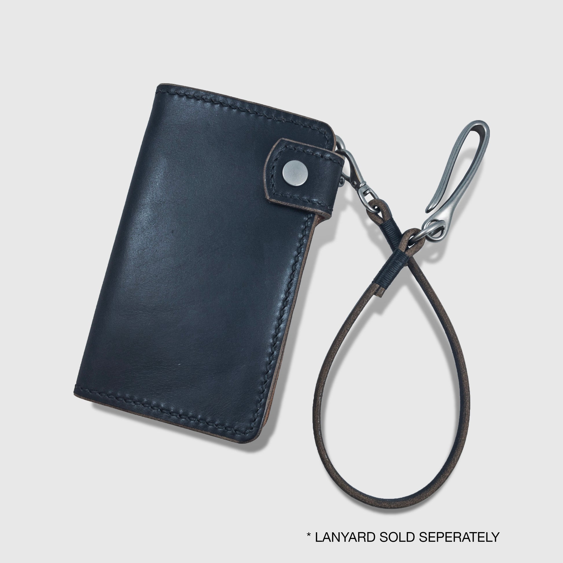 A more compact take on a biker wallet without sacrificing any storage. Features 6 angle-cut card slots, a spacious cash pocket, snap closure, and includes a shackle for connecting a lanyard or chain.