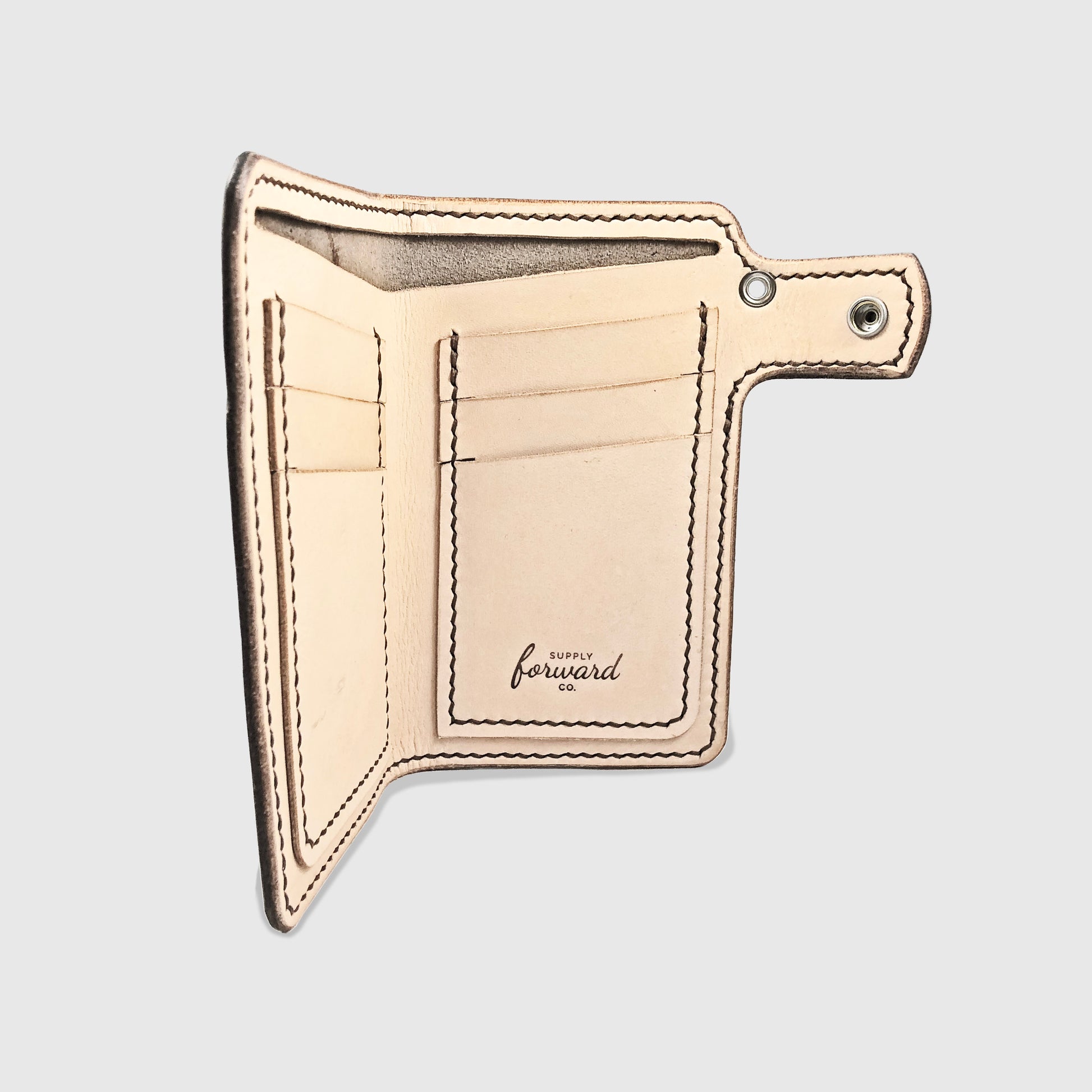 Carefully stitched using 4/5oz USA tanned exterior, 2/3oz Vegetable tanned interior, nylon waxed thread, with beveled and burnished edges.
