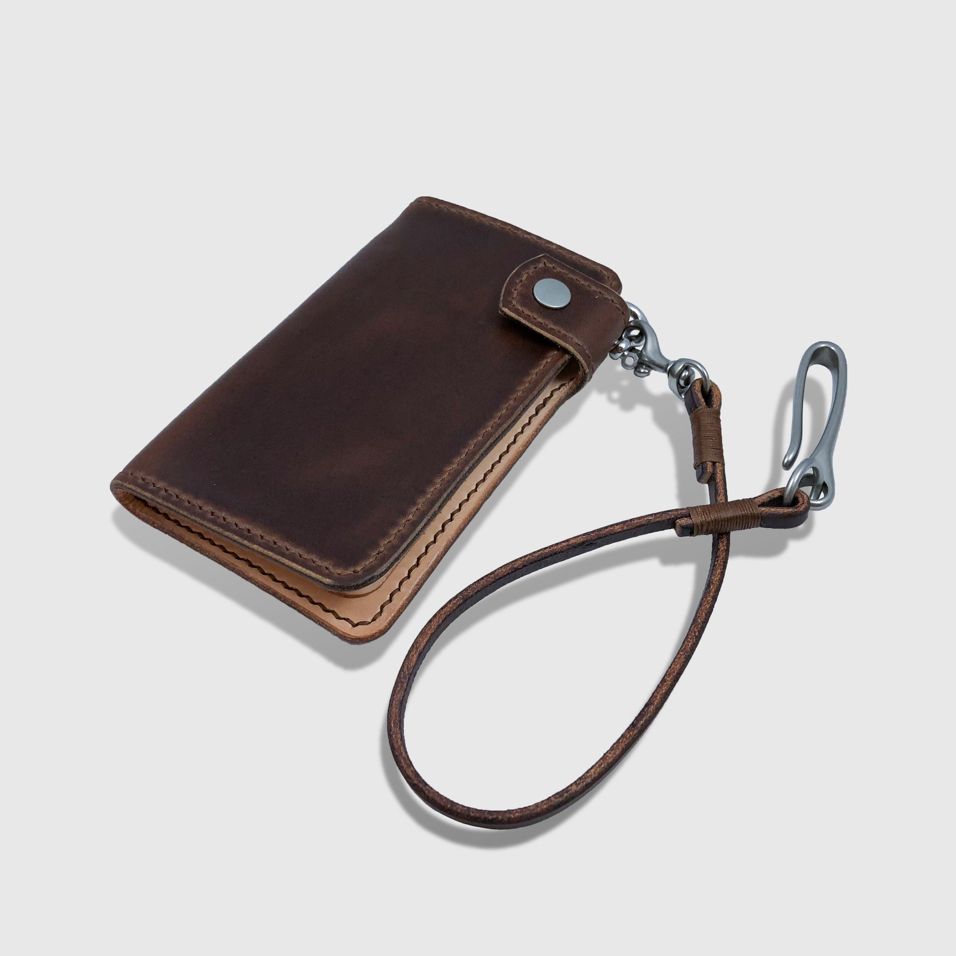 A more compact take on a biker wallet without sacrificing any storage. Features 6 angle-cut card slots, a spacious cash pocket, snap closure, and includes a shackle for connecting a lanyard or chain.
